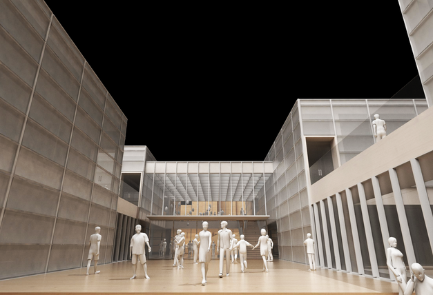 En términos técnicos, la propuesta incorpora materiales resistentes y sobrios como concreto expuesto, que ofrecen durabilidad y protección climática. Grandes lucernarios y patios intermedios permiten la entrada de luz natural, mejorando la eficiencia energética del conjunto. El resultado es una arquitectura pública austera, funcional y simbólicamente potente, que revaloriza el rol de lo colectivo a través de un espacio abierto, central y compartido.